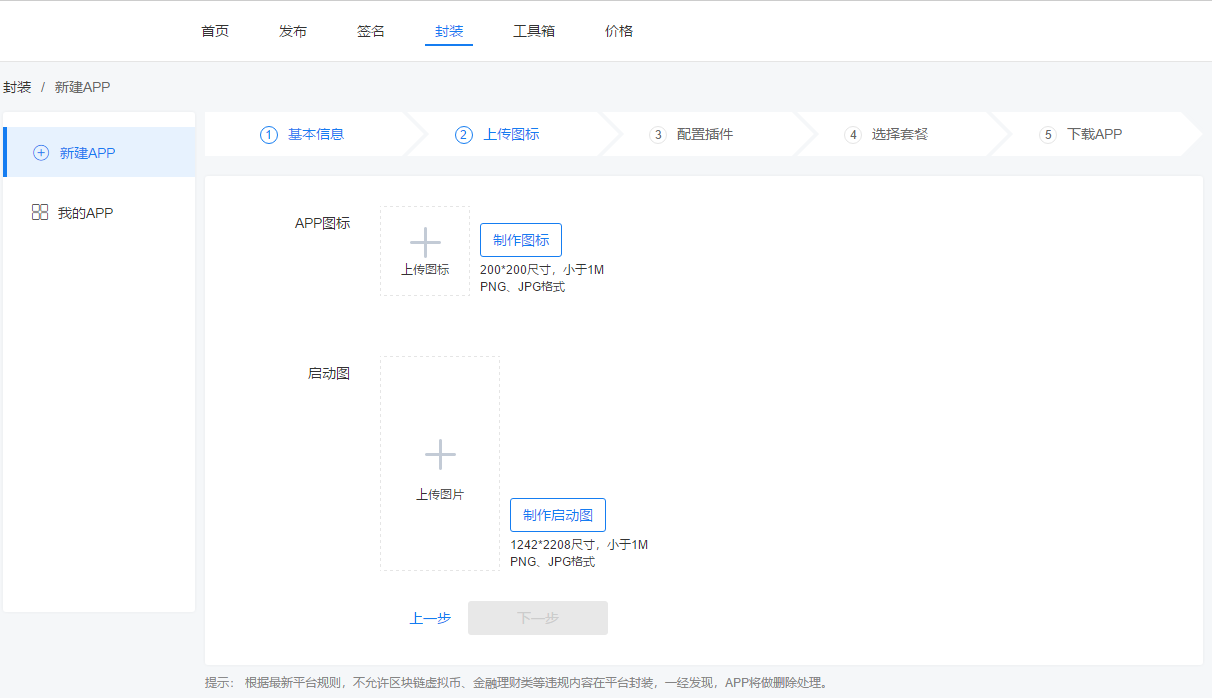 APP图标和启动图都为必填选项,支持图片上传,也支持在线制作。